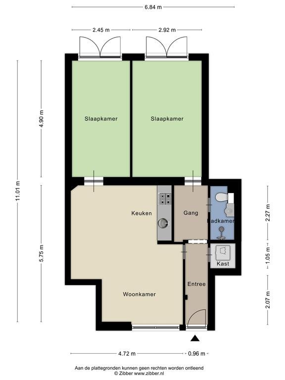 Entree/hal, toegang naar de lichte woonkamer met open keuken, 2 slaapkamers die beide toegang bieden tot de zonnige, ruime tuin – ideaal voor buitenleven en ontspanning, moderne badkamer met douche, wastafel en toilet. In de hal is de opstelling van de C.V.-ketel en hier kun je de wasmachine plaatsen.