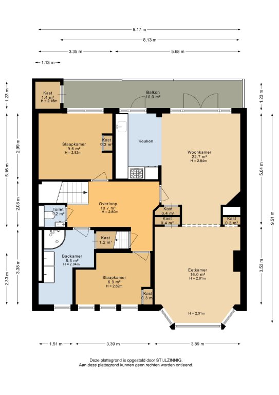 Tweede verdieping: overloop met toegang tot toilet, twee slaapkamers, badkamer en woon-/eetkamer met open keuken waar vanuit het balkon te bereiken is