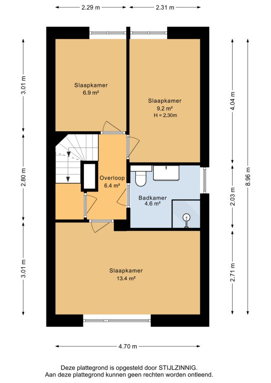 Eerste verdieping: overloop met toegang tot drie slaapkamers (ca. 13,4 m², 9,2 m² en 6,9m²) en de badkamer.