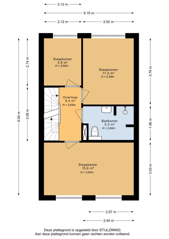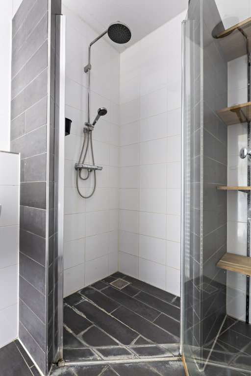 Eerste verdieping: overloop, 3 slaapkamers, badkamer met douche, wastafel en toilet.