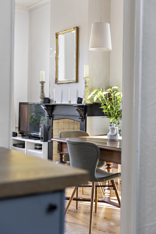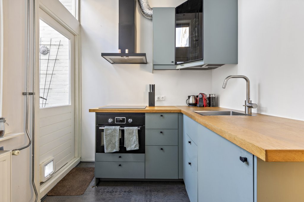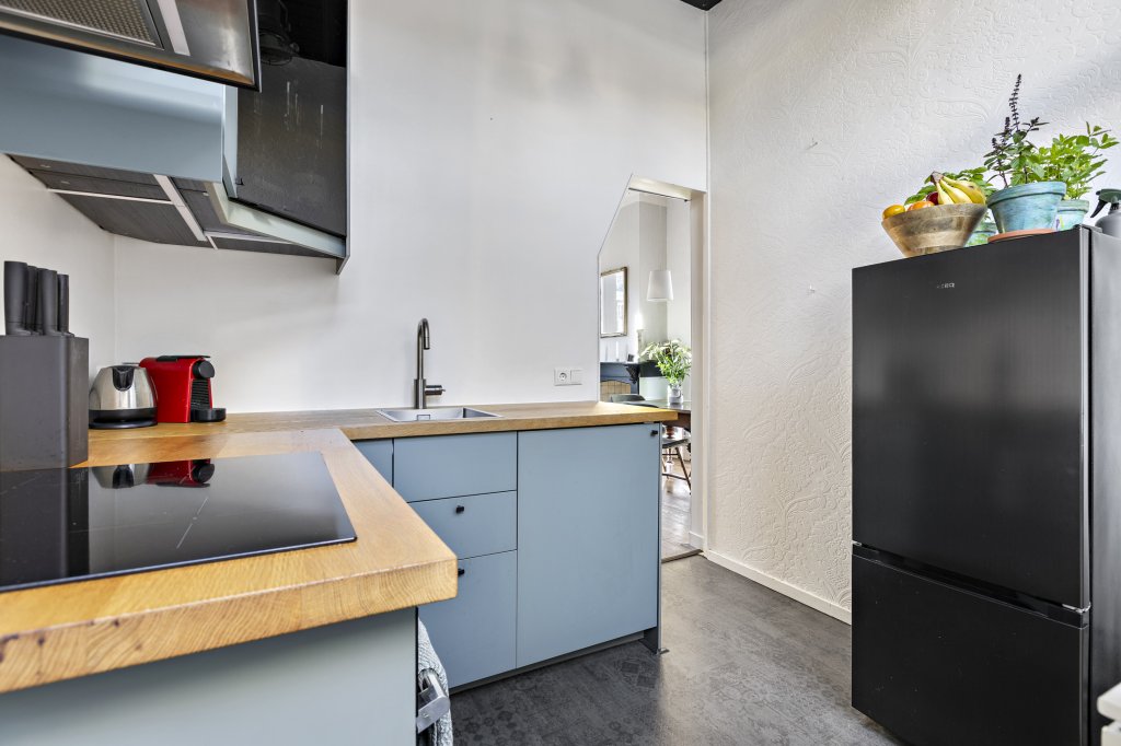 De woonkamer ademt sfeer en gezelligheid, met een fraaie houten vloer en zicht op het groene voortuintje. De moderne keuken is stijlvol vernieuwd en voorzien van inbouwapparatuur en een doordachte indeling – ideaal voor wie van koken en gezellig tafelen houdt.