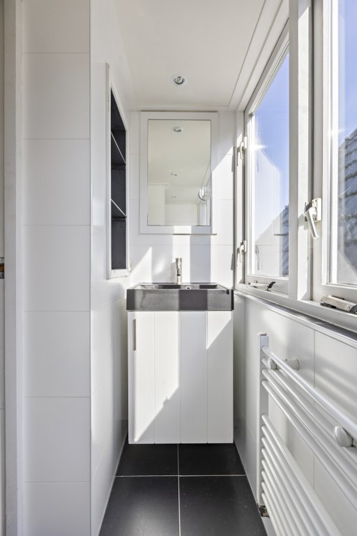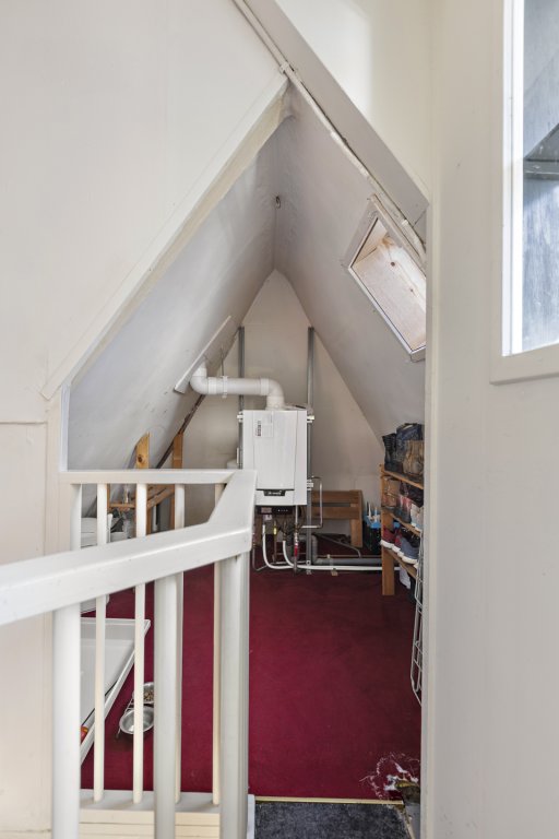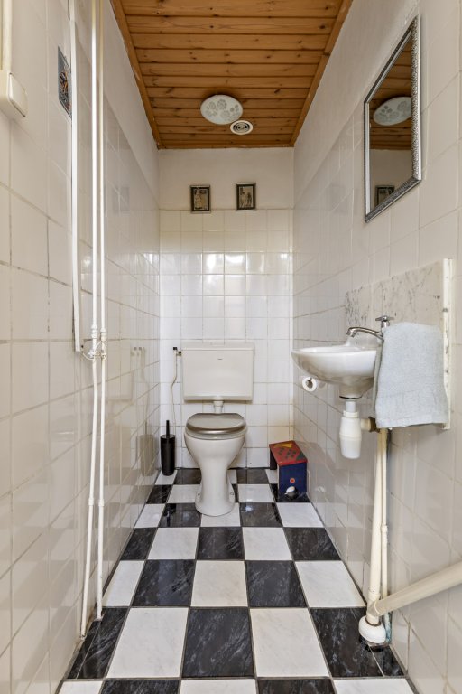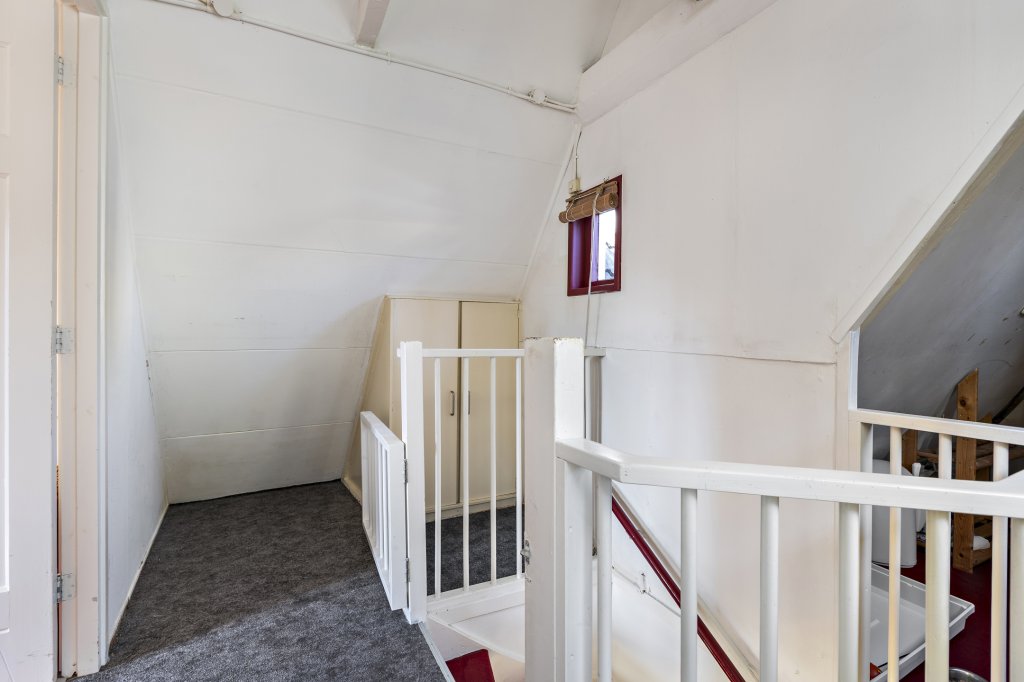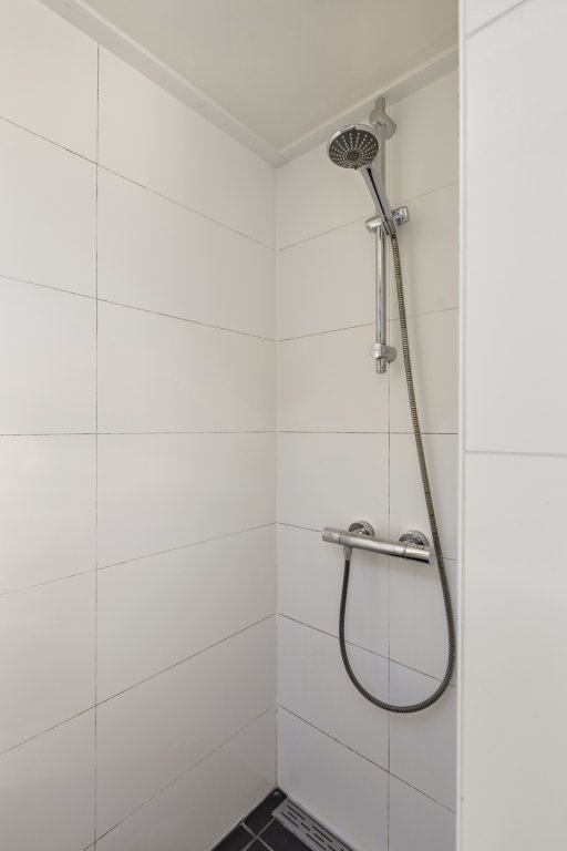 De badkamer is netjes en eigentijds uitgevoerd, met moderne tegels, een ruime douche en een frisse uitstraling. Boven vind je een knusse slaapverdieping, waar de karakteristieke kapconstructie zorgt voor een intieme en huiselijke sfeer.
