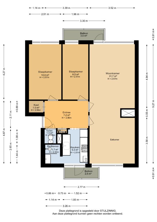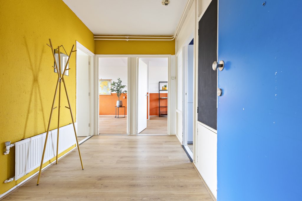 Hal met toegang tot keuken, woon-/eetkamer, twee slaapkamers (ca. 10.8m² en 8,5m²) en het toilet. Vanuit de keuken is de badkamer en balkon op het oosten te bereiken. Vanuit de woonkamer is het balkon op het westen te bereiken.