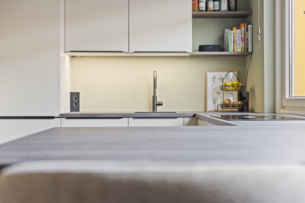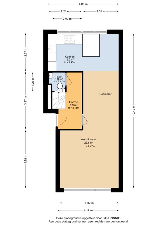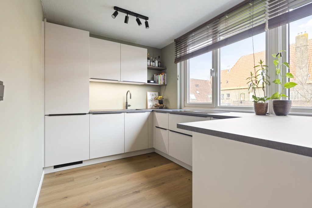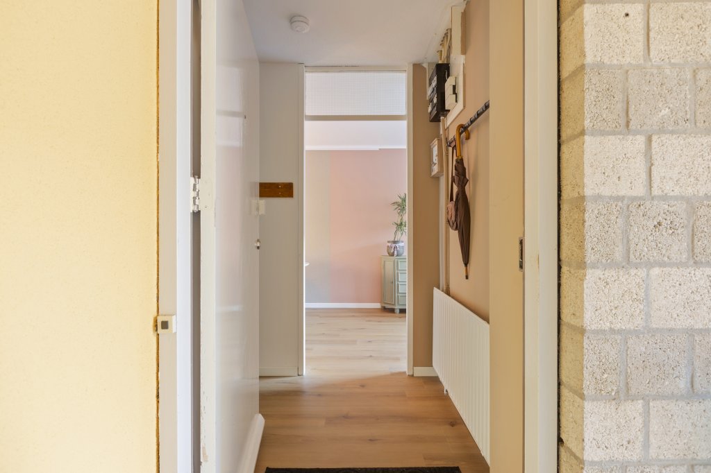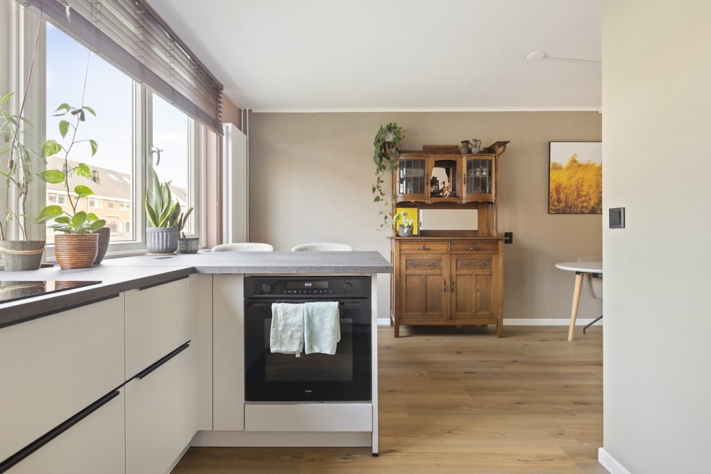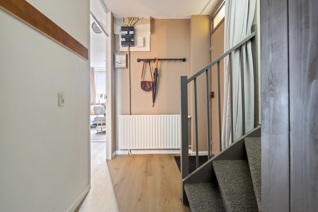 Eerste verdieping: entree, hal met toilet, lichte en ruime woonkamer met deels open keuken. De keuken is nieuw (2025) en voorzien van inbouwapparatuur (vaatwasser, koelkast, vriezer, Bora afzuiging, Quooker en oven). Vaste trap naar de tweede verdieping.