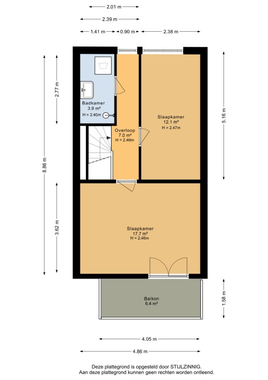 Tweede verdieping: Twee ruime slaapkamers, waarvan 1 toegang tot het balkon en badkamer (voorzien van wastafel, douche en witgoedaansluiting).