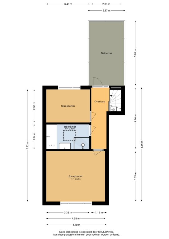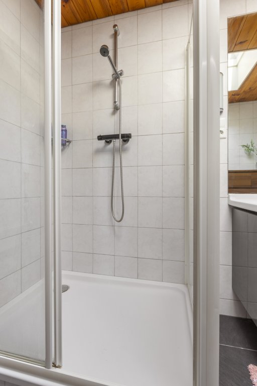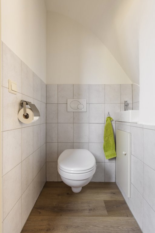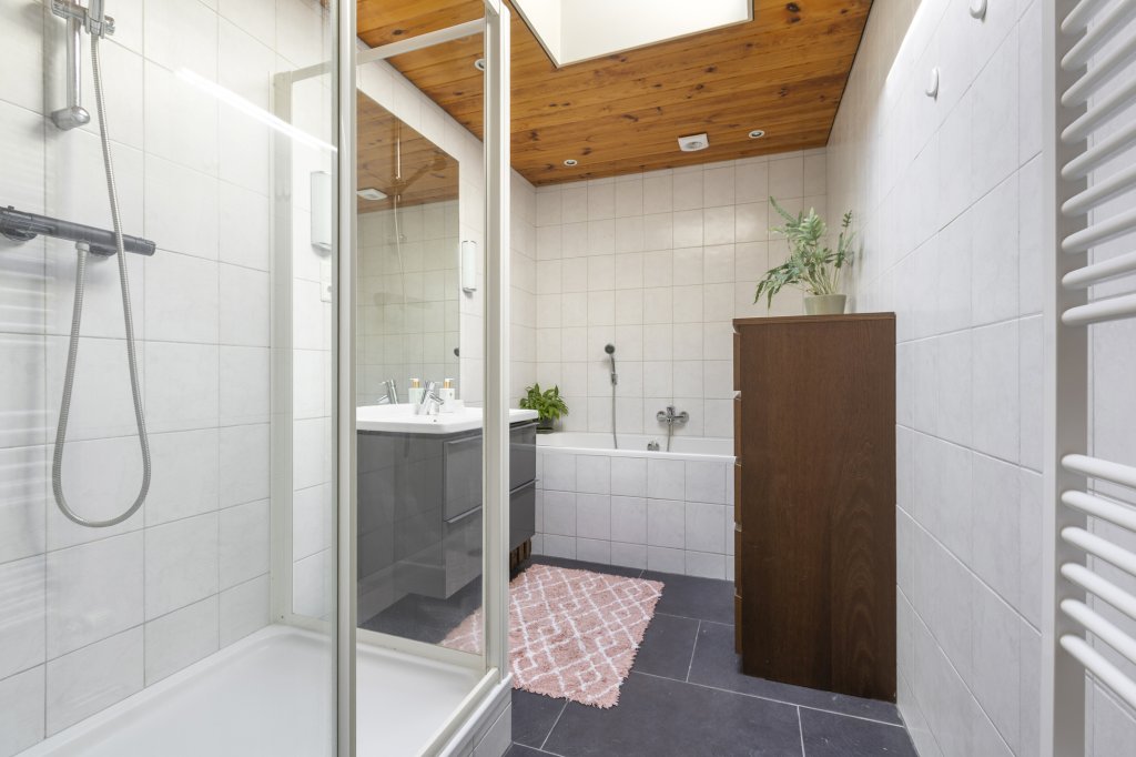Eerste verdieping: overloop, twee slaapkamers, badkamer met bad, douche, wastafel en een lichtkoepel, op de overloop is een deur naar het dak van de uitbouw hier is het mogelijk om een dakterras of wellicht een groen dak aan te leggen.