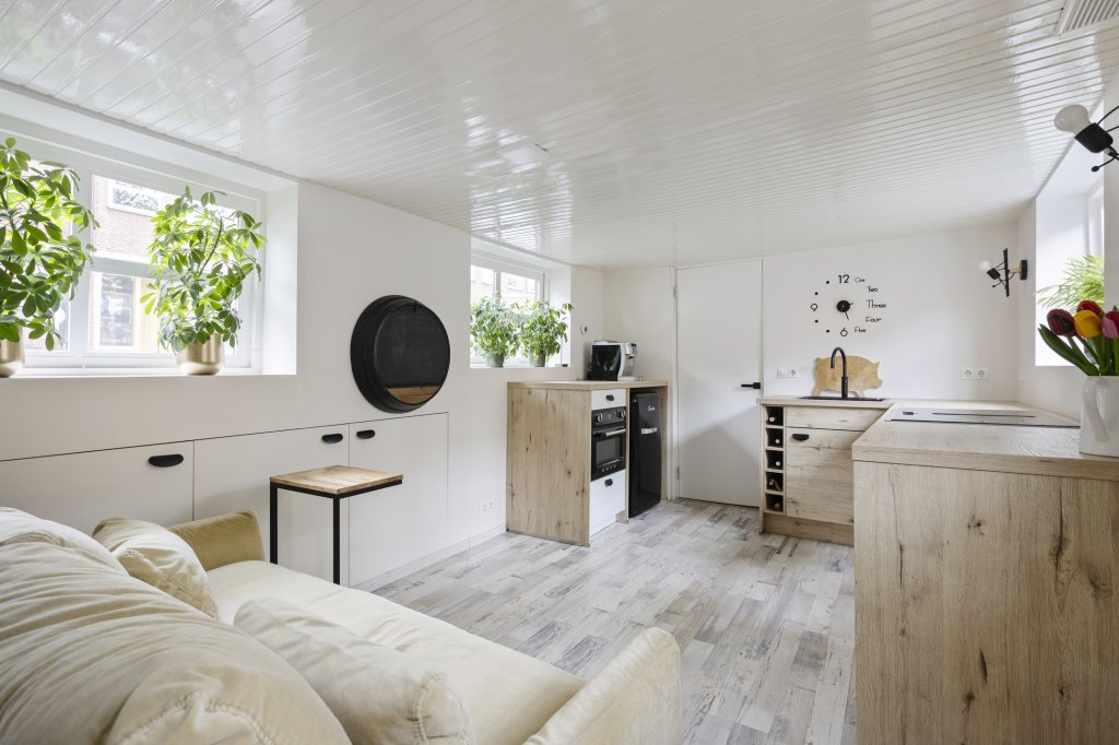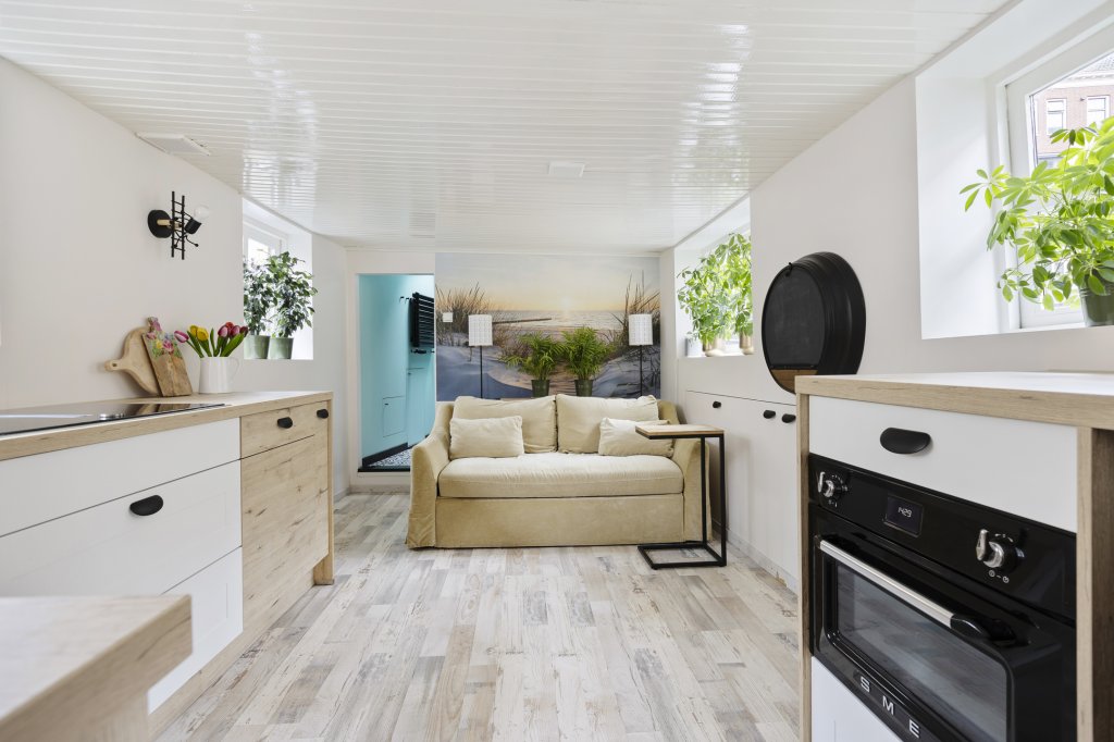 Bij mooi weer schuif je het luik aan de achterzijde open en sta je zo op je eigen knusse terras aan het water, waar je een kop koffie kun drinken of borrelen met uitzicht op de langsvarende bootjes en de historische stad. Als kers op de taart wordt de woonboot geleverd inclusief een eigen sloep – ideaal voor een spontane tocht over de grachten.