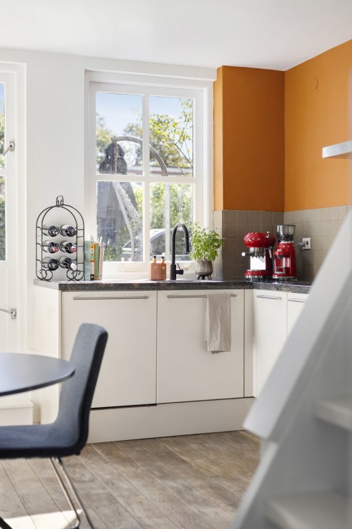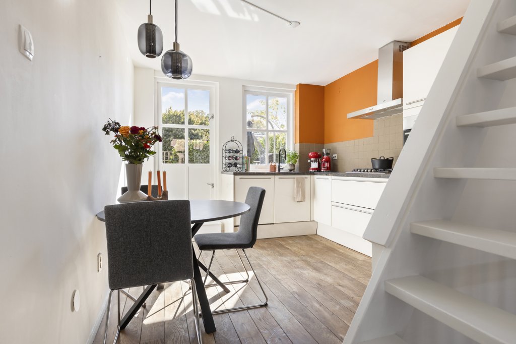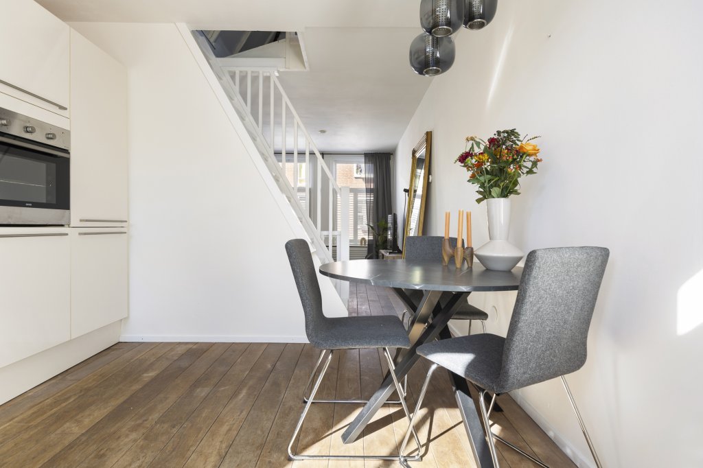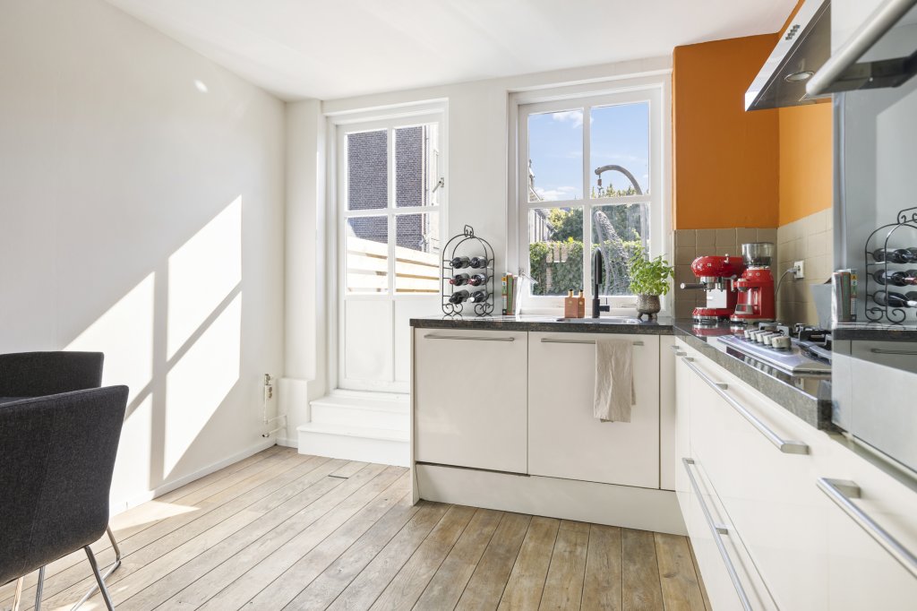 de half open keuken en een zonnig terras, maken dit huis tot een unieke plek. Doordat de slaapkamers op de begane grond zijn gesitueerd heb je meer privacy in de woonkamer, welke op de eerste verdieping ligt. En loop je zo met een kopje koffie het zonnige dakterras op! Met drie slaapkamers, een moderne badkamer en dat riante dakterras is dit dé ideale woning voor stadsliefhebbers die