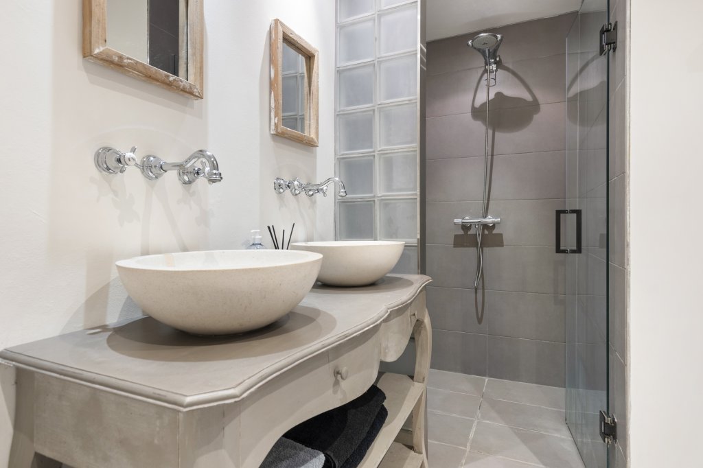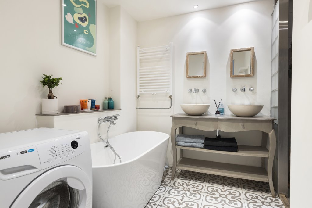 je op begane grond een moderne badkamer met inloopdouche, wastafelmeubel en wasmachine-aansluiting, én een