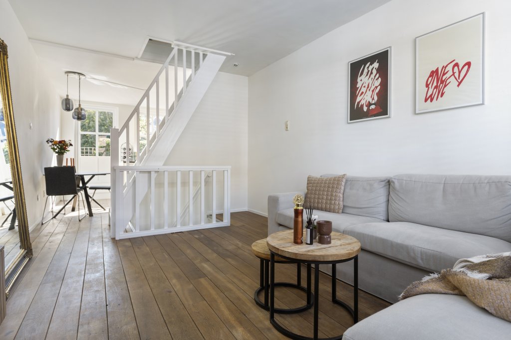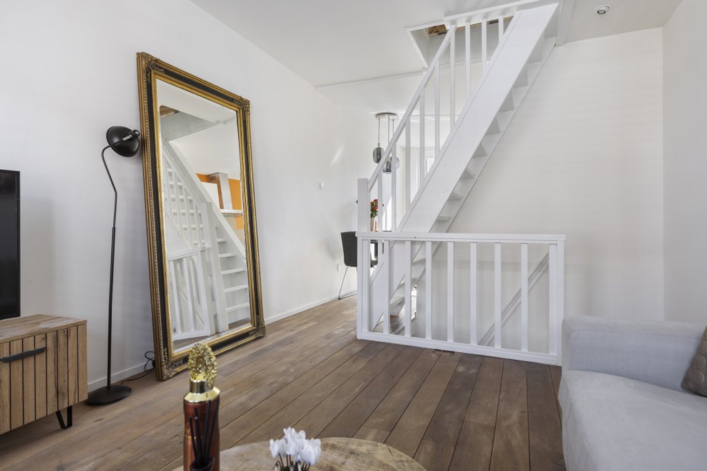 De trap komt uit in de lichte woonkamer (ca. 20 m2) met een open verbinding naar de keuken. De moderne keuken
