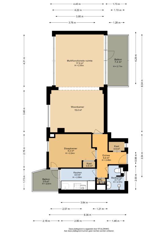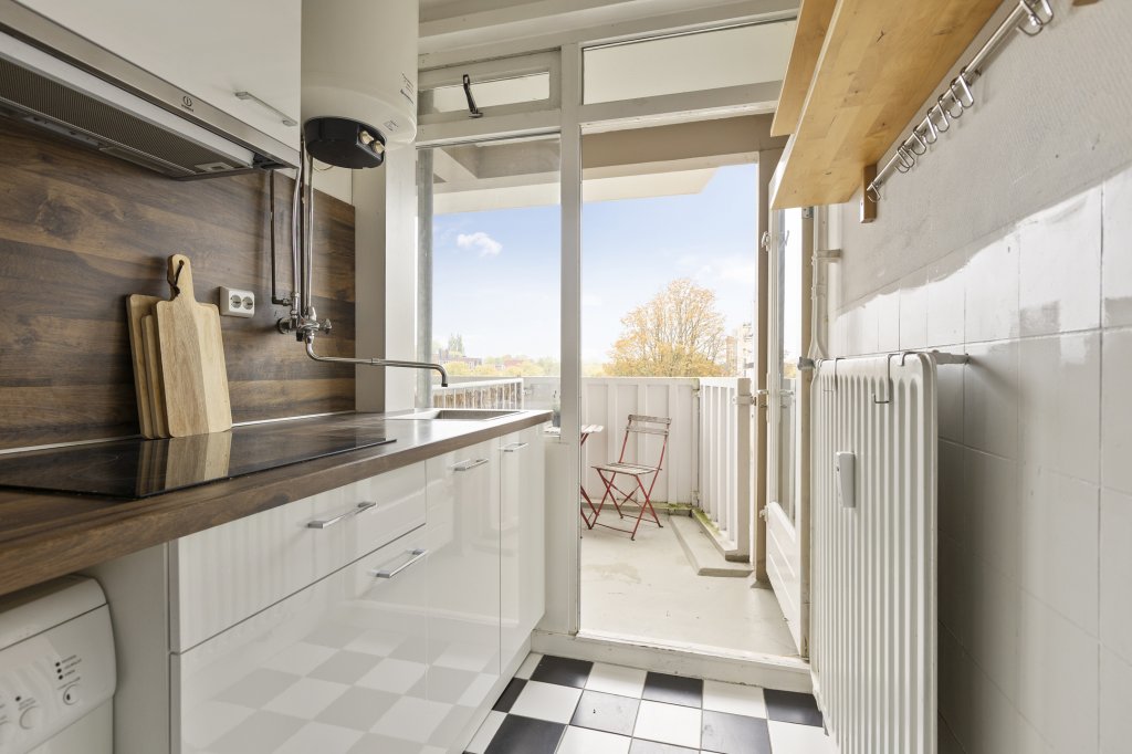 Via de hal bereik je de keuken, voorzien van diverse inbouwapparatuur en toegang tot het tweede balkon (ca. 4 m²). Daarnaast vind je een nette slaapkamer (ca. 9 m²), een inpandige berging, een apart toilet en een badkamer met douche en wastafel.