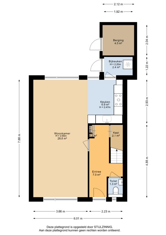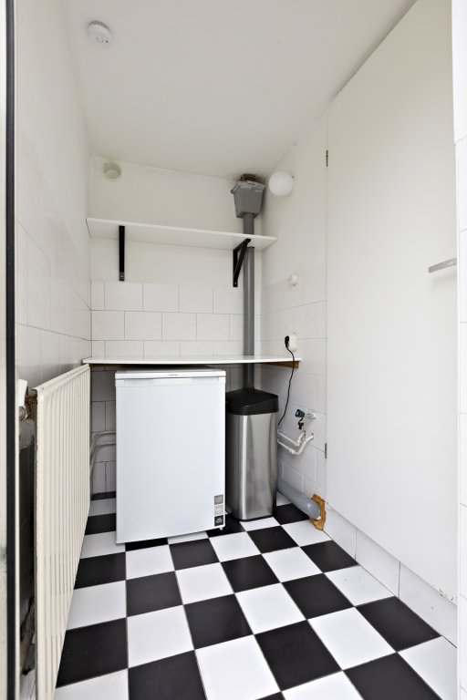 Begane grond: Entree met toegang tot het toilet en de woonkamer met open keuken. Via de keuken is de bijkeuken te bereiken.