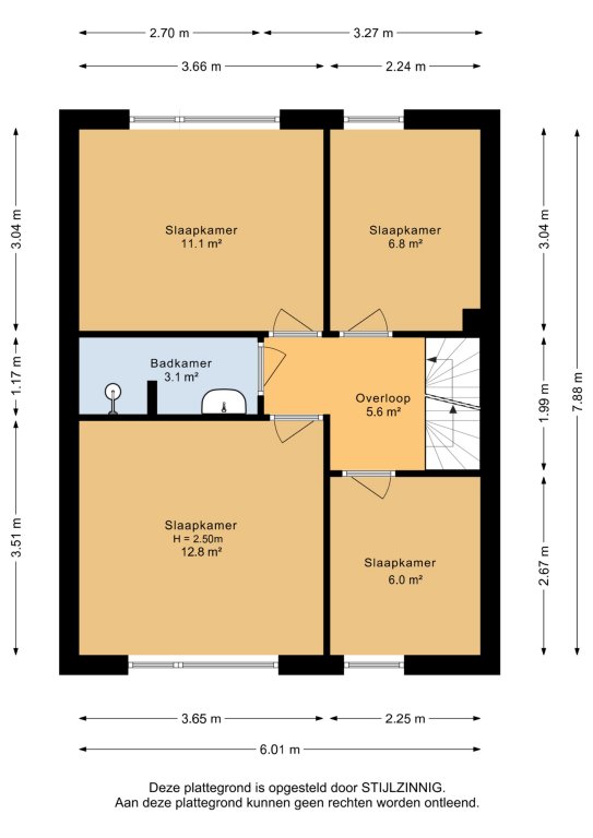 Eerste verdieping: overloop met toegang tot vier slaapkamers (ca. 12,8m², 11,1 m², 6,8m² en 6 m²) en de badkamer