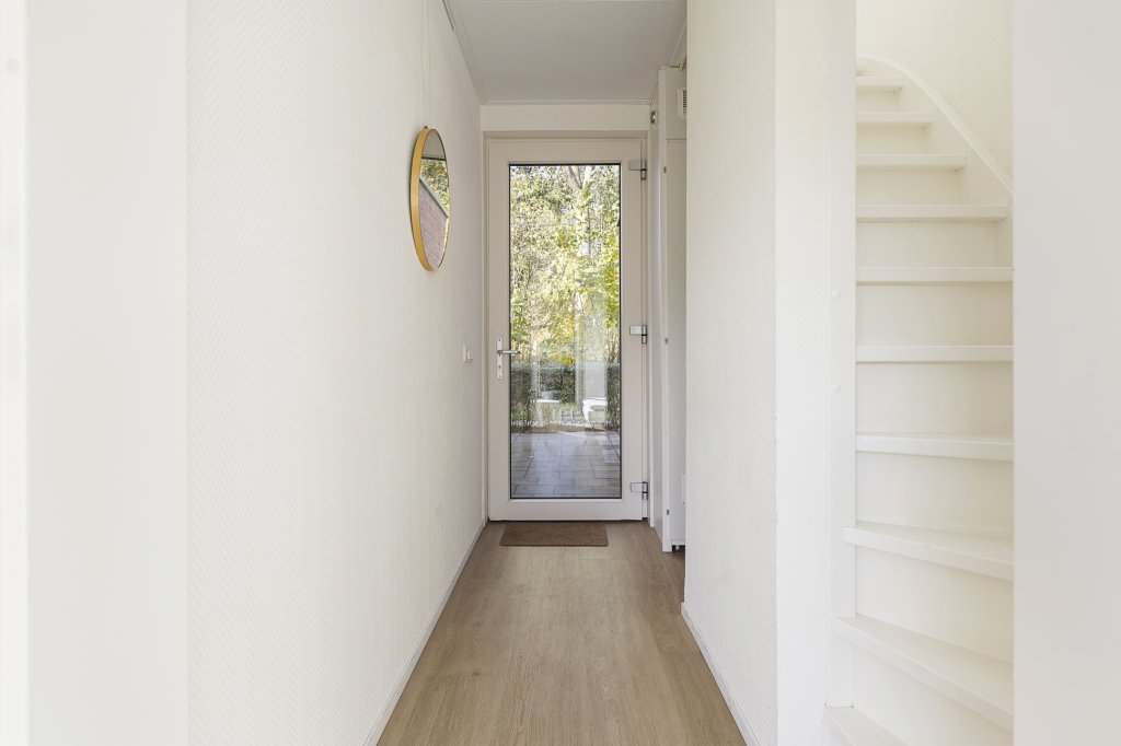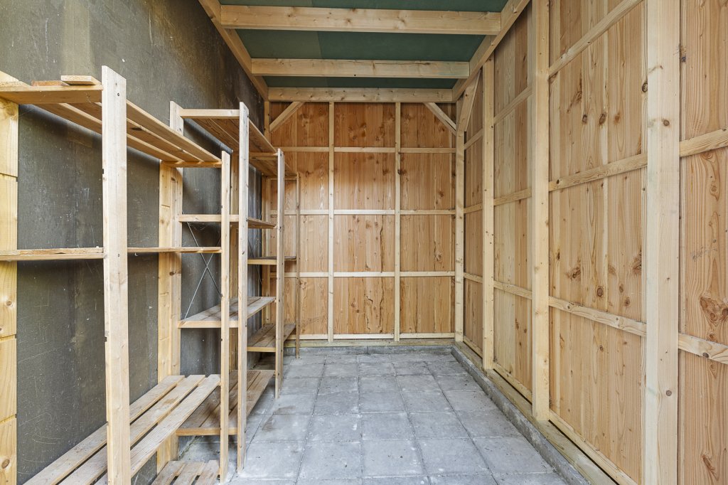 Begane grond: entree/hal met toegang tot de woonkamer met open keuken en trapopgang. Via de woonkamer is de tuin en de eerste slaapkamer (ca. 6,6 m²) te bereiken. Via de woonkamer met open keuken heeft u ook toegang tot de hal met toegang tot de badkamer. Aan het huis zit een een houten berging (ca. 6,1 m²)